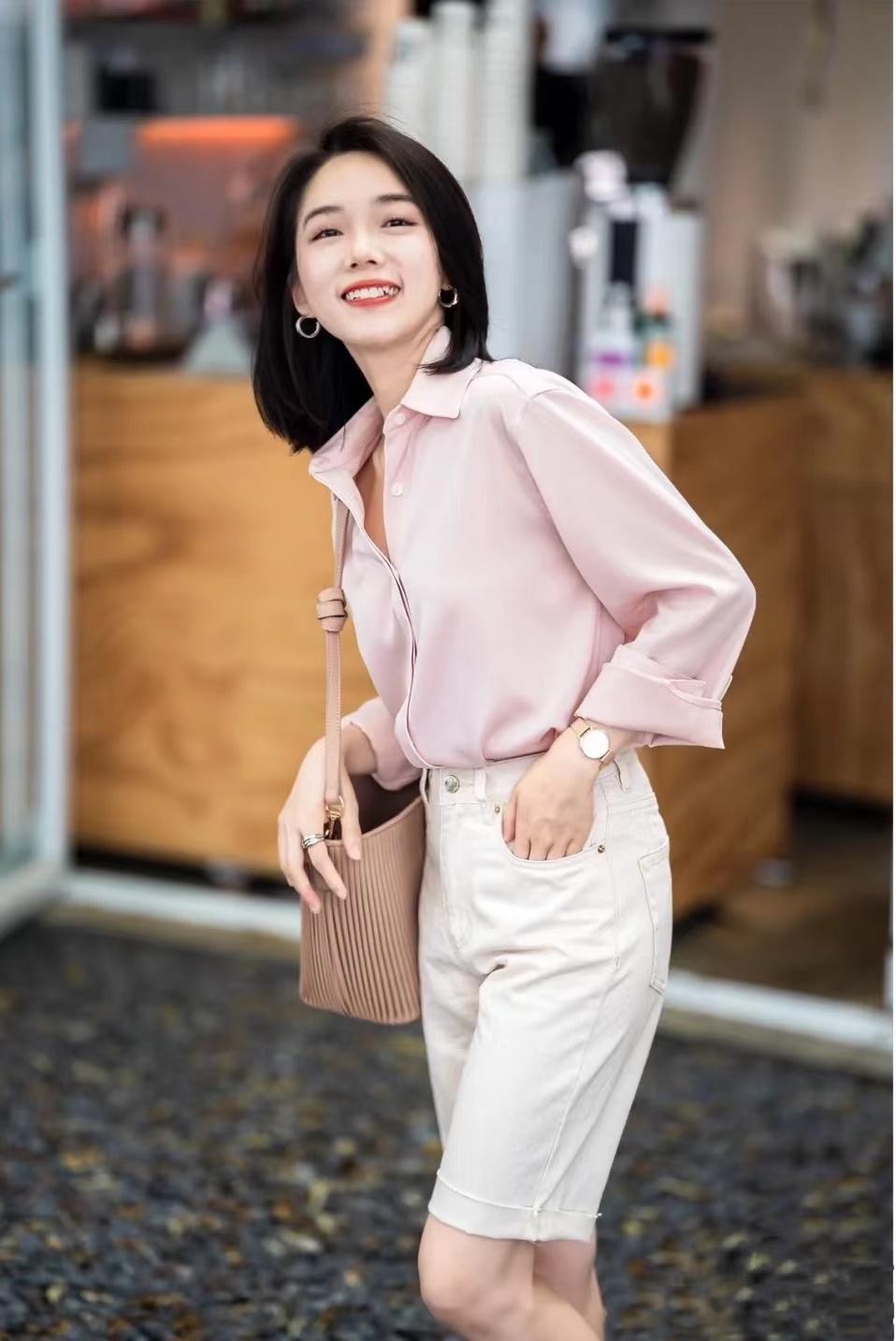 选择真丝衬衫的时候,色彩的搭配更加重要。豆沙粉的真丝衬衫,对于三四十岁的女人来讲,就是一种为优雅又时尚的搭配,清新大气,减龄时尚,不挑肤色。