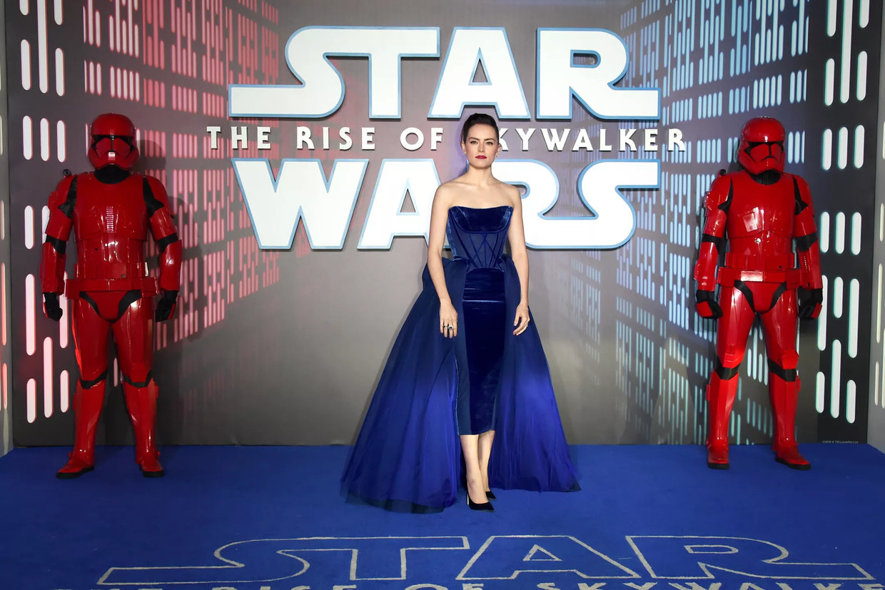 星战的另一位女演员Daisy Ridley则穿着西太后的宝蓝色礼服登场,让两边的红色暴风兵都黯然失色。