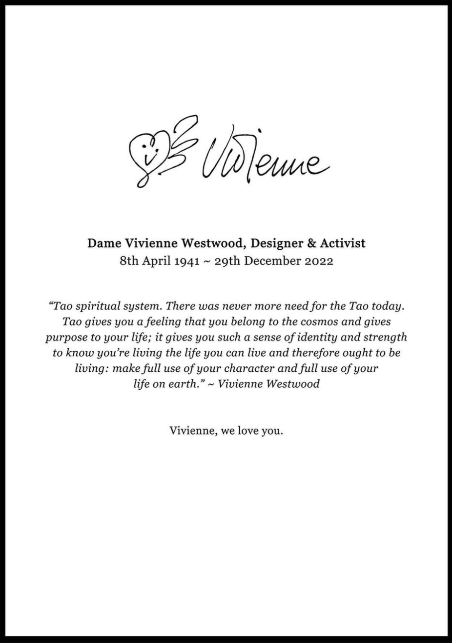讣告中这样的写着:“Vivienne始终做她自己喜欢的事情,直到生命的后一刻。她做设计、做艺术、写书、改变世界。她有着令人惊叹的人生,在过去60年间创造了巨大的影响力,并将继续影响后世。”