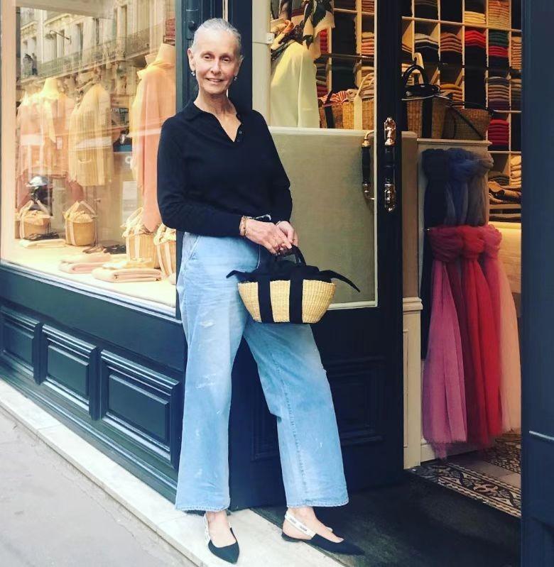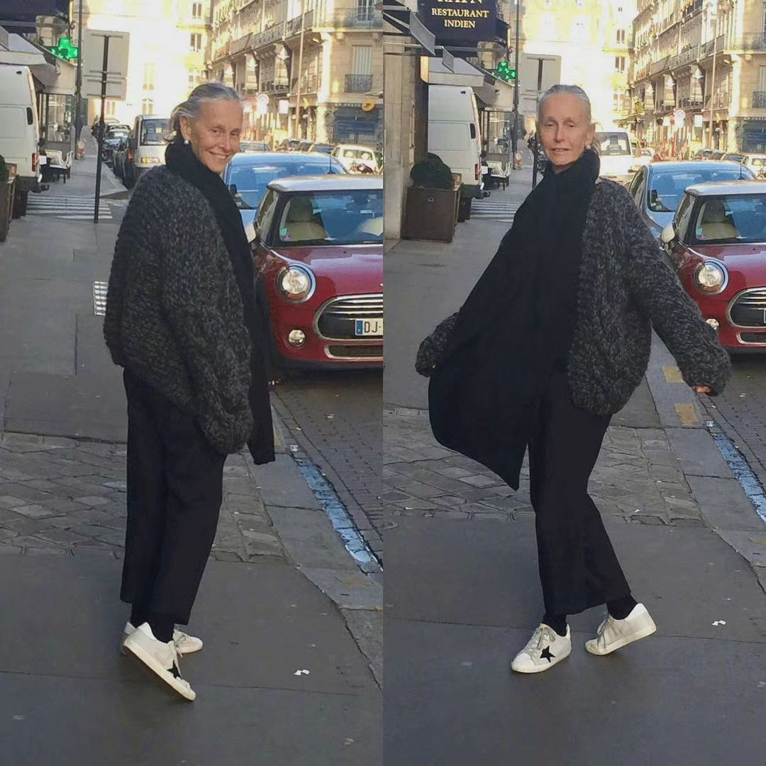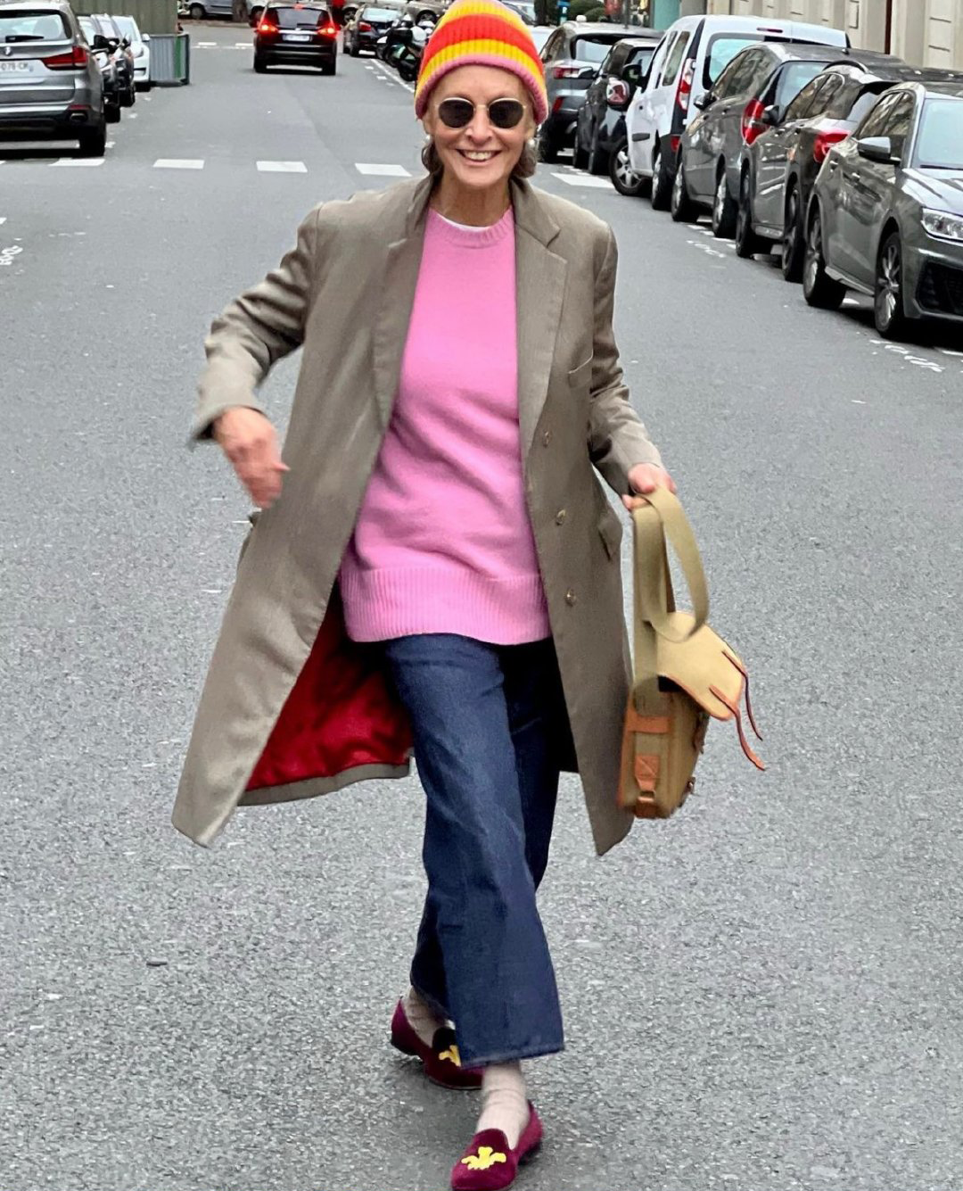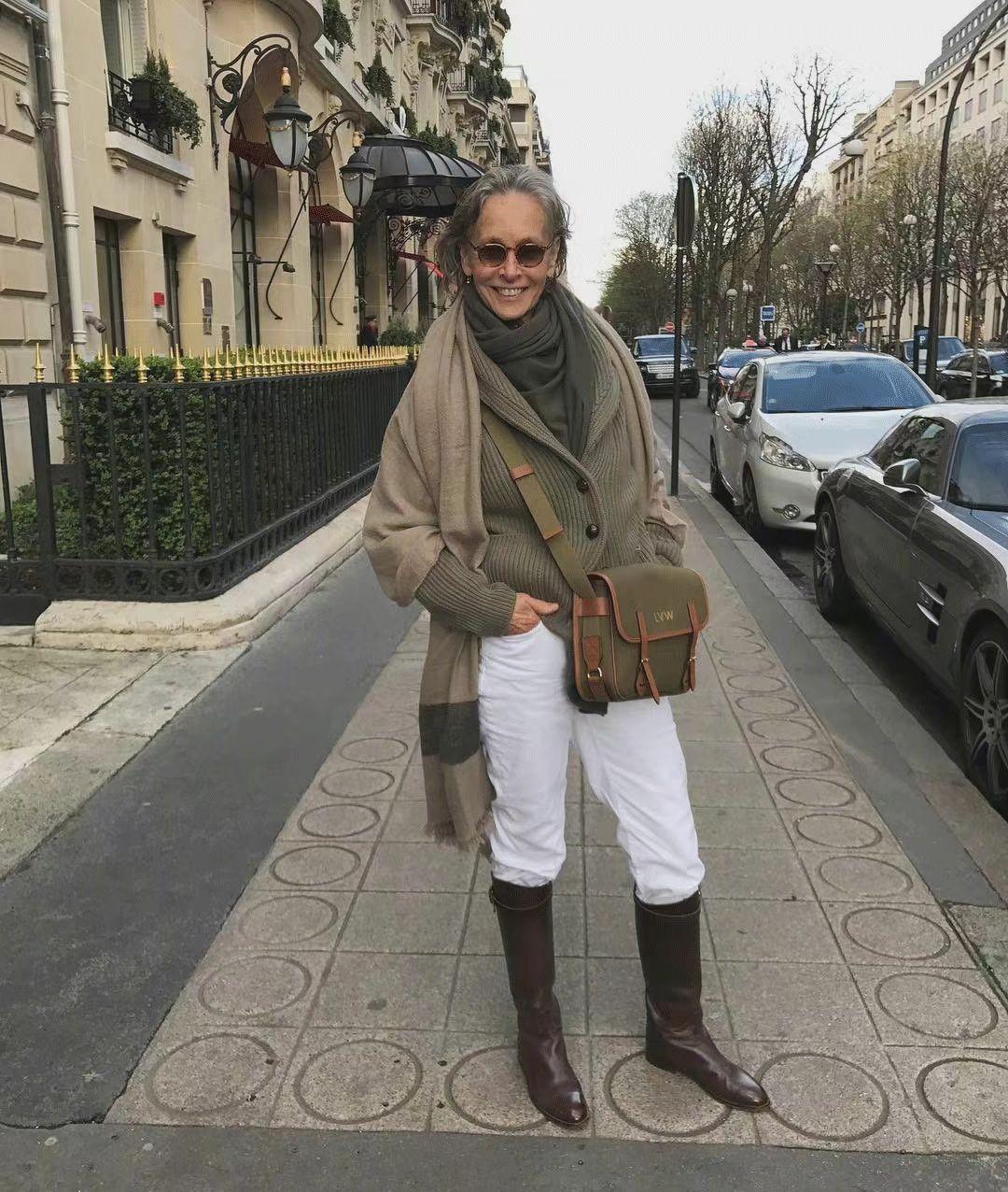 宽松的浅粉色毛衣搭配上驼色围巾以及牛仔阔腿裤,整体造型随性又休闲,可以凸显出这位时髦老奶奶淡然随性的生活态度,浅粉色单品在她身上一点也不踩雷,反而格外显气质。