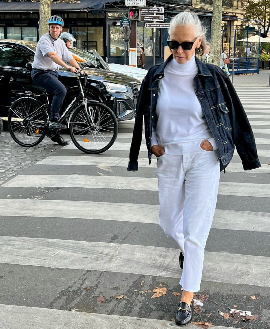 个性十足的白发老奶奶选择把短款深蓝色牛仔外套披肩穿在身上,这样显得十分时髦有气场,配上墨镜以及乐福鞋,酷帅又气派。