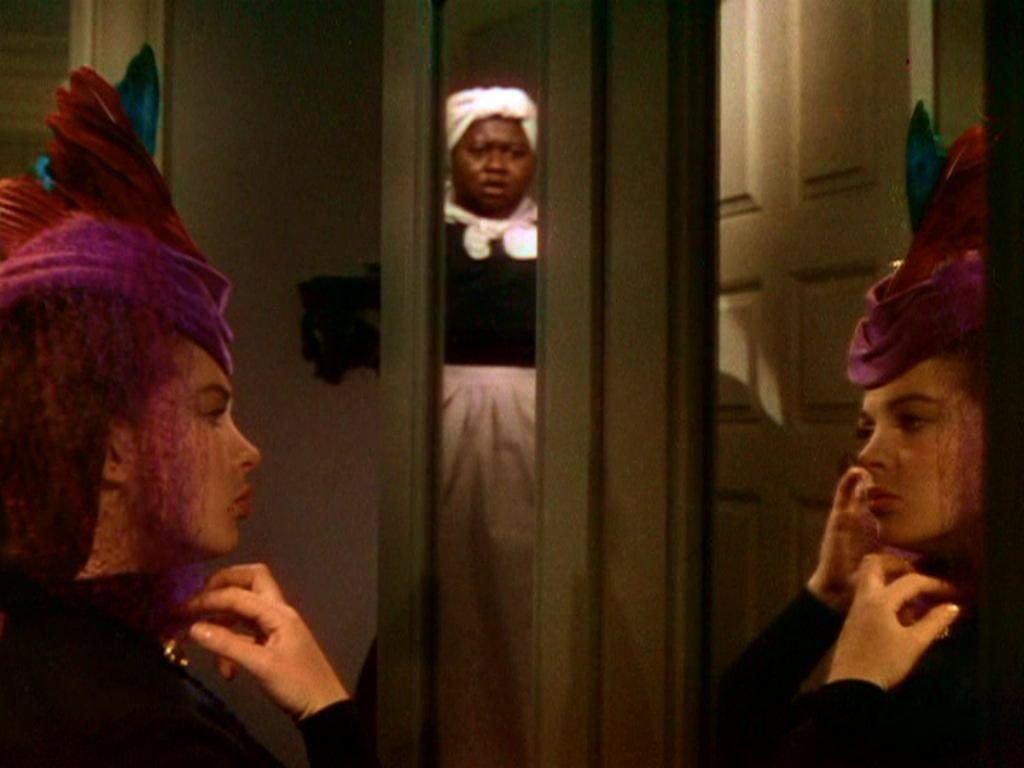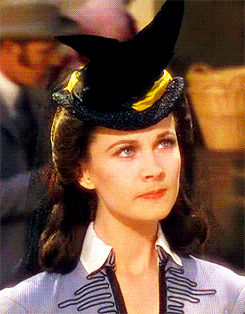 斯嘉丽完全不喜欢守寡的限制,她不想穿死气沉沉的寡妇服装,她在镜子前试戴她活泼的紫红色帽子。