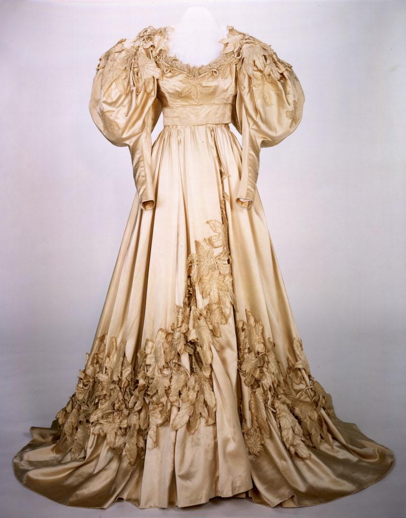 裙子领口装饰巨大的浮雕胸针,裙摆没那么夸张,后臀部的巴斯尔裙撑勾勒出迷人的S曲线。