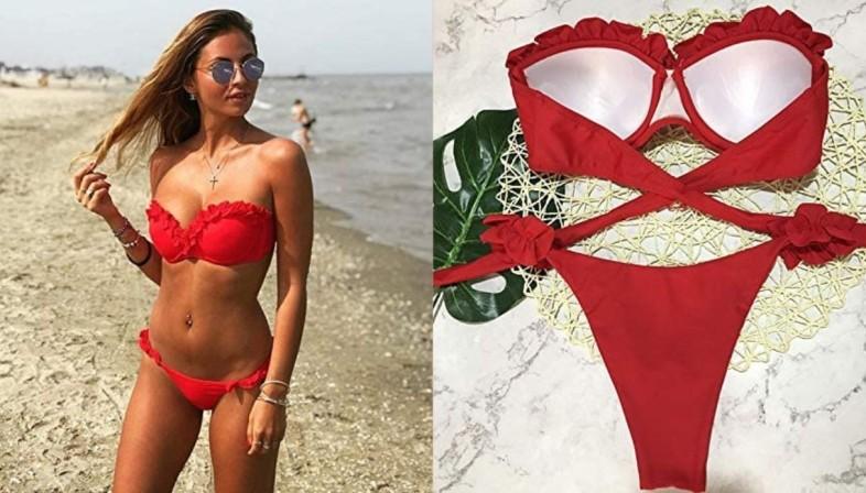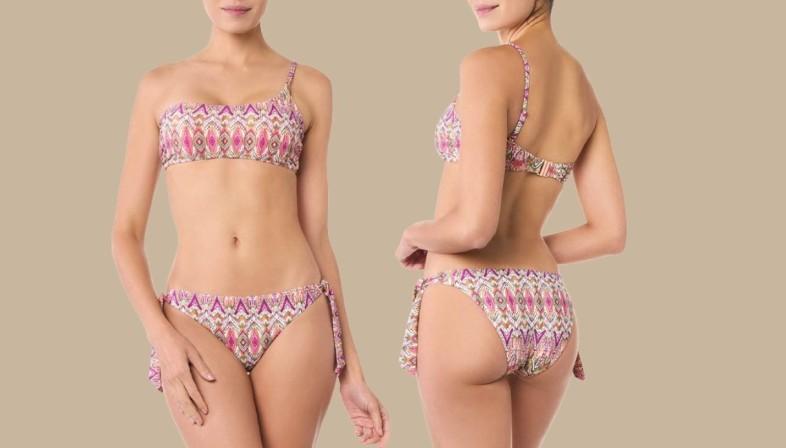 两件套泳衣色调细腻,舒适,剪裁经典永恒,适合年轻的人。预成型和带蕾丝的三角裤,能更好地展示女性的线条美。