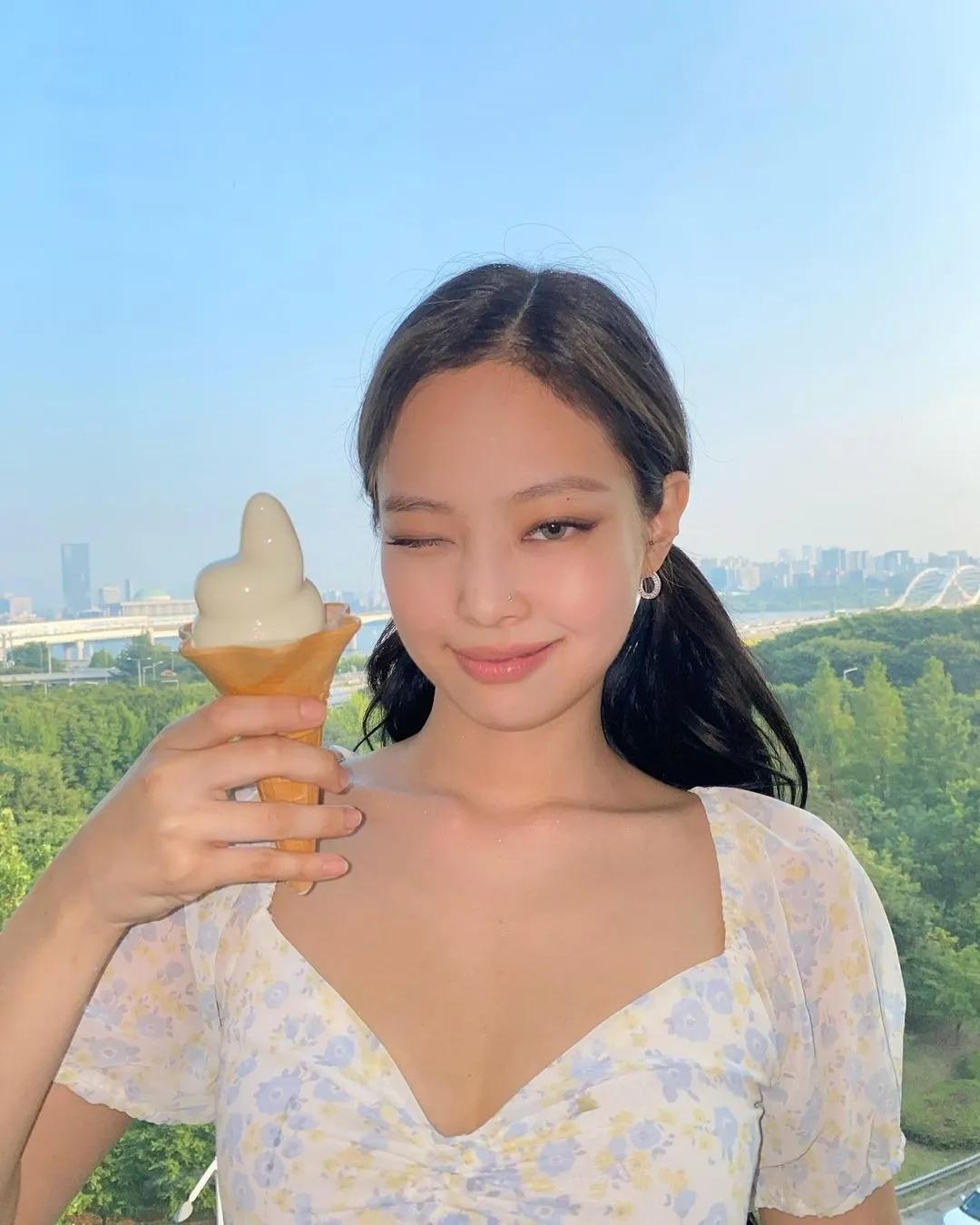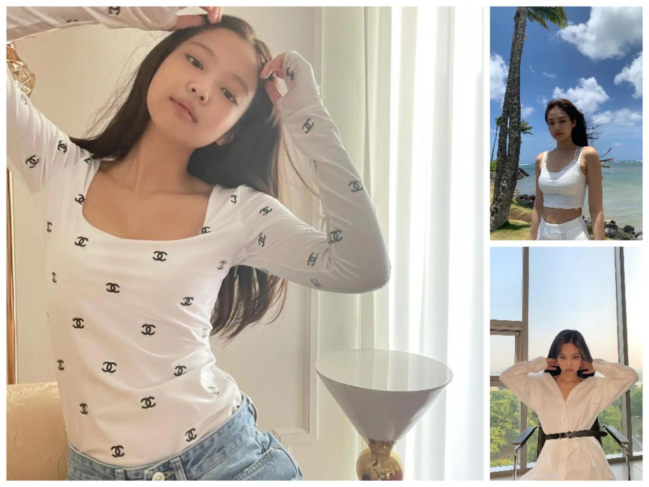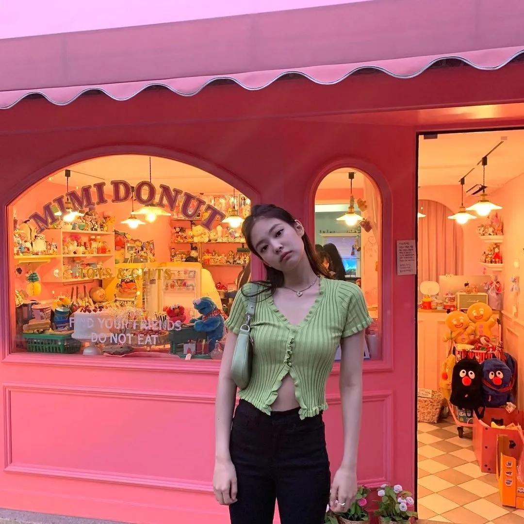 Jennie以透肤的肤色上衣内搭一件黑色小背心,充满性感~