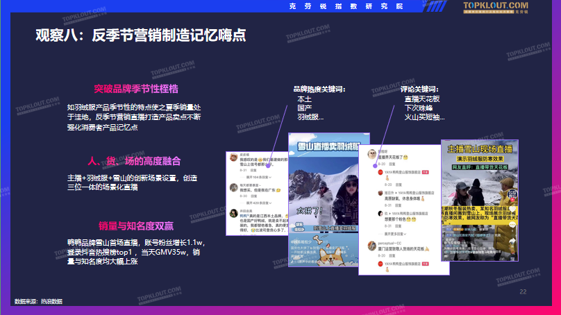 打破常规营销,制造传播亮点,能够帮助品牌迅速出圈。对服装品牌来说,反季节营销更容易强化消费者产品记忆点,同时直播间创新场景的设置,在社交网络中也能够被迅速捕捉,继而迎来知名度和销量的双重提升。