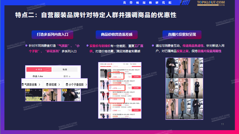 自营服装品牌相对来说品牌力较低,在内容引流上更加用心,通过针对不同消费者痛点打造多个产品特性入口,以此吸引消费者。部分账号同样将直播拆条并连续发布,以上身展示和价格优势传递商品焦虑性,刺激消费者持续关注。