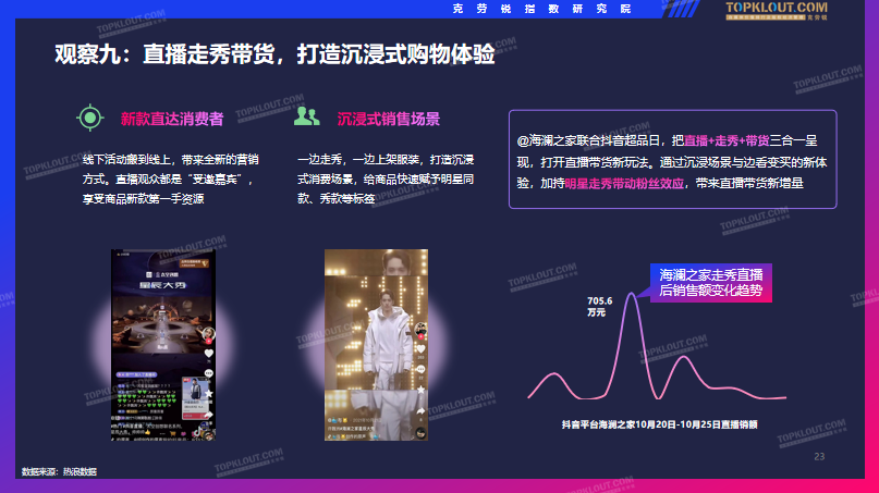 走秀活动作为服装品牌营销的传统方式,也从线下逐渐走到线上。观众既可以在直播间感受秀场氛围,也能迅速购买新品服装,沉浸式消费场景带来不一样的购物体验,也能够带动起品牌的销量。