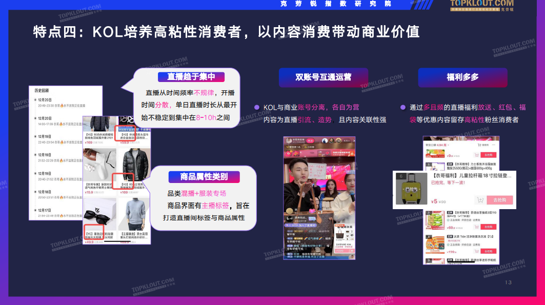 KOL在直播时间上趋于集中且直播时长也相对固定,在直播商品也大多以品类混播+服装专场为主。直播过程中以多且高频的福利放送等留存消费者,堆积高粘性粉丝消费者。