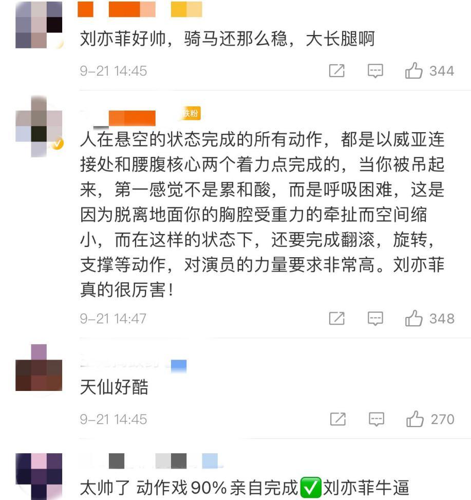 网友们在看到这段拍摄花絮后,很多人都被刘亦菲敬业的精神打动了,因为人在完全悬空的状态下完成这些动作,还是很有难度的。于是很多演员会选择用替身来完成高难度动作,而刘亦菲却能够亲自上阵,的确是很厉害了。对此,不少网友纷纷称赞:"太敬业了吧"。