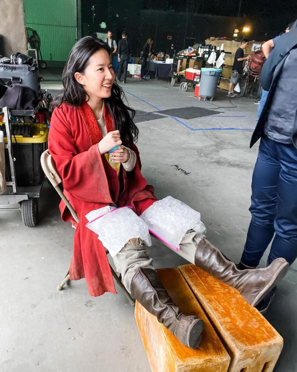 而在此之前,刘亦菲被曝出过几张拍摄电影时的幕后照。拍摄的环境比较艰苦,她身上的戏服也早已沾上了许多灰尘,腿上还敷着冰袋,似乎是在为了消肿,这也说明她拍戏的时候是很辛苦的,但是她依然露出了甜美的笑容。
