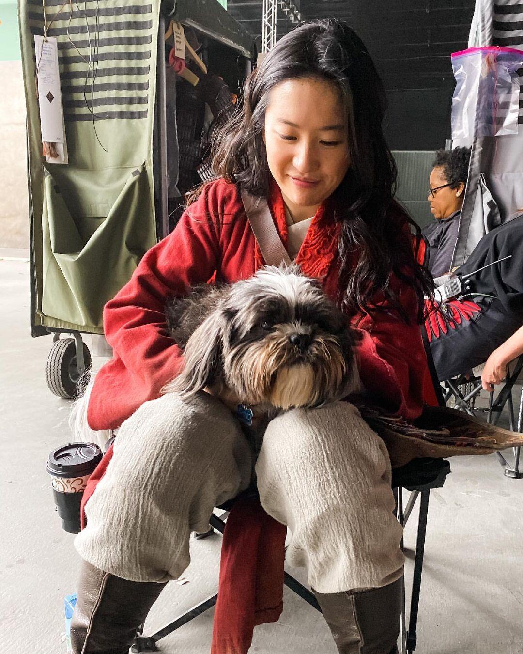 在片场她也很有爱心,会将可爱的狗狗抱在怀里,低头温柔地看着它,画面温馨和谐。