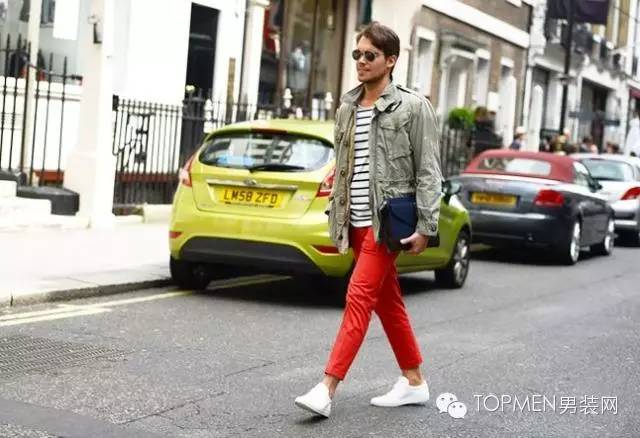 百搭的条纹T恤加亮色橘红长裤,外罩军绿色休闲外套,推荐给年假要出门旅行的型男。↓↓↓