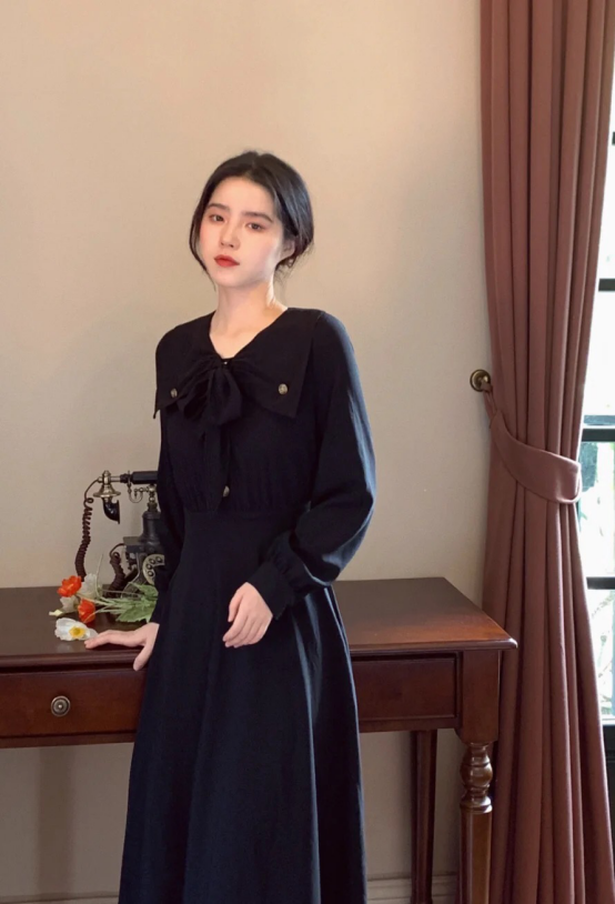 这件长裙要简单许多,将黑色的显瘦功发挥得淋漓尽致,简直就是温柔典范,因为娃娃领的加入,让年轻女生也能驾驭如此贵气的单品,领口两侧的金属扣子也以极具光泽感的风格来引人注意,腰部线条也变得更加柔软。