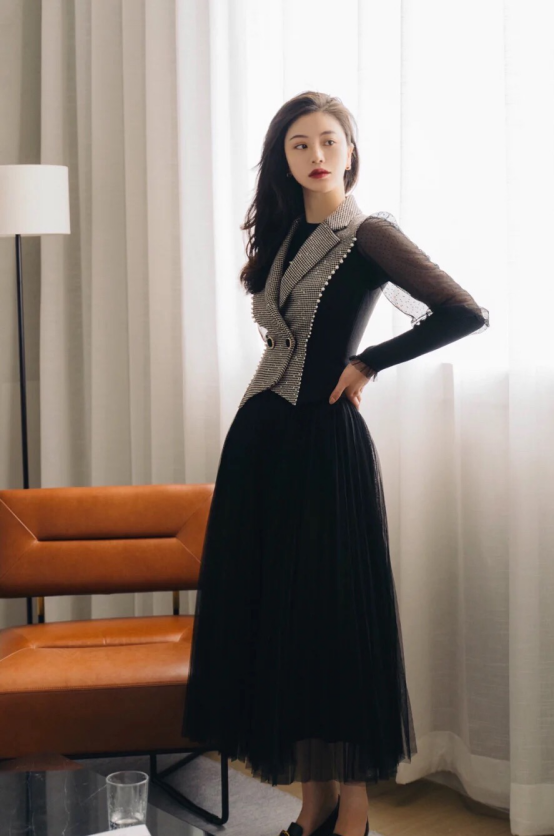 这件长裙简直就是高个子女生的专属,超长裙摆即使是通过多层薄纱进行叠加也不会觉得臃肿,反而塑造了宫廷的蓬松果,静谧的黑色格外端庄,上衣则是沿用了当下十分流行的西装领,立体设计在塑造气场方面起着点睛之笔的作用。