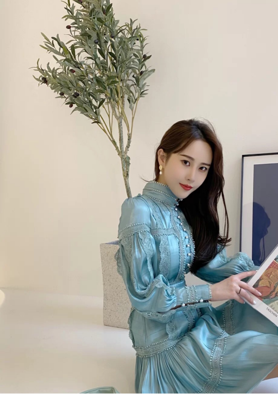 要想让原本清新的天蓝色变得更加贵气,饰品装饰与点缀显得尤为重要,在裙子的边缘处加入珍珠和亮片进行勾勒,原本清纯的蕾丝元素立马变得高级起来,不仅有肩撑来修饰不的脖颈线条,衣袖的灯笼形状更是集温柔与甜美为一体。