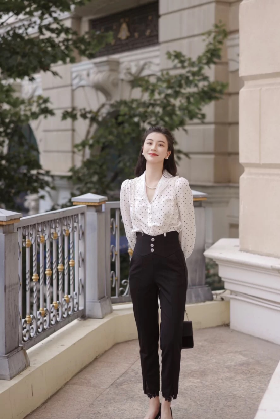 其实即使是职场女性依旧可以塑造宫廷风造型,这条西装裤腰部的设计宛如中世纪的马鞍型束腰,在三颗扣子的点缀下精美无比,裤脚下方的黑色蕾丝与领口边缘的白蕾丝将禁欲气息展现,深v的空间也因珍珠项链的点缀而变得优雅。