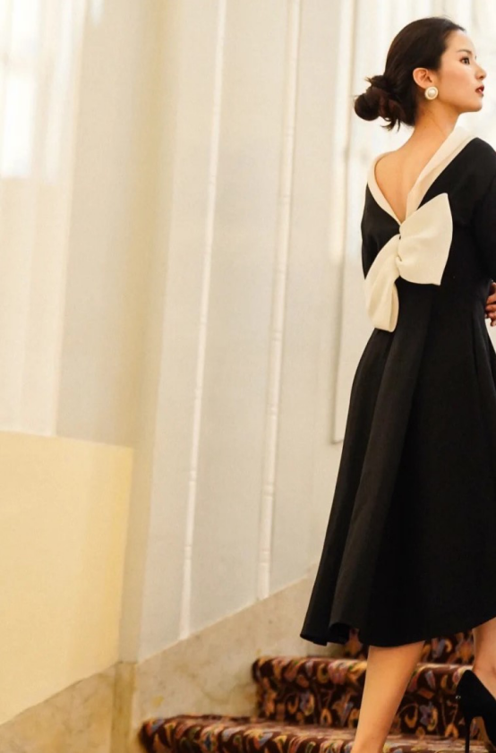 要是没有纤薄美背,一般女生不敢尝试这样v型领口的露背装,宽大裙摆与高跟鞋简直就是知性的化身,既可以修饰不的身材曲线,同时比例也会得到完善,在纯黑裙子边缘利用白色绑带作为装饰,庞大蝴蝶结也不失甜美。