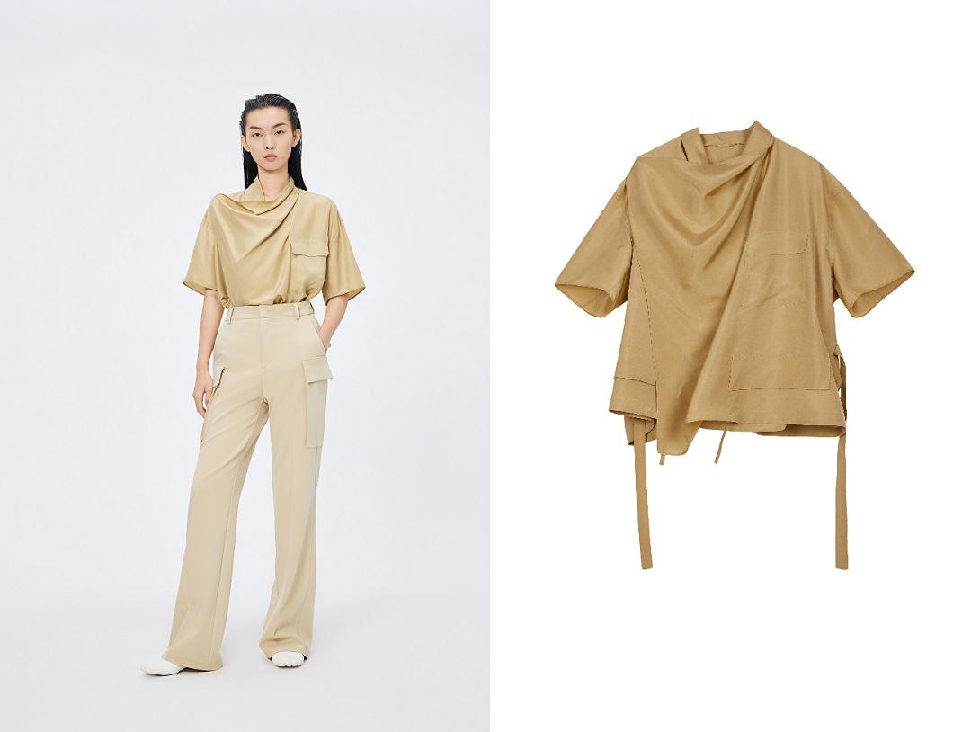 发自于无边空旷平原的美学联想给埃及主题系列带来极简的廓形,象征金字塔的精致“壳”感造型打造出有控制的廓形比例,少量捏褶增加女性美感。融入埃及传统服饰特有的缠裹式设计,用时尚个性的艺术手法解构造型的美感。低浓度且柔和的整身现代配色令人不禁产生空旷的空间遐想,更显精致摩登。在细节设计上注重功能性的打造,螺纹裤腿、袖口以及腰身,不仅提升穿着舒适度,更显女性曲线,同时也能很好地应对春季微凉微风的气候。工装大口袋设计能够轻松满足各种户外需求,十分实用。
