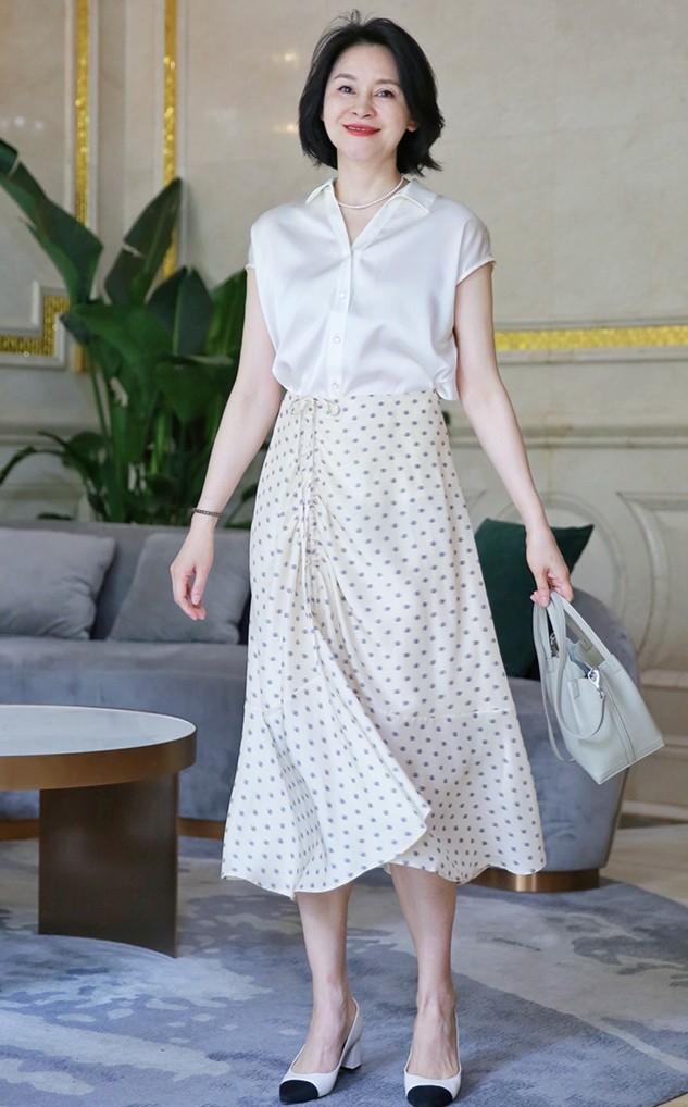 白色桑蚕丝上衣光泽感十足,珠光白十分靓丽,在夏季可以打造贵气感, 小v领很显脸小,无袖衬衫露出纤细的手臂,下身搭配浅色的波点长裙,复古又甜美,鱼尾的裙摆勾勒出腰臀比,黑白相间的尖头高跟鞋在视觉上拉长小腿长度,打造比例。