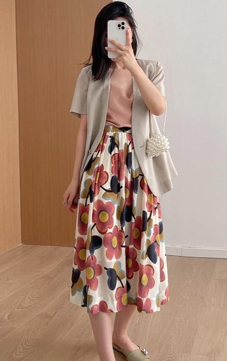 二、桑蚕丝半身裙夏天怎么少得了清凉的绿色?这身用蕾丝开衫作为上装,以绿色为底色,白色素花点缀在裙上十分清新,半身裙对于身材的包容度很高,苹果型,沙漏型,梨形的姐妹都可以尝试像这身再搭配一顶编织草帽就适合出去度假穿。