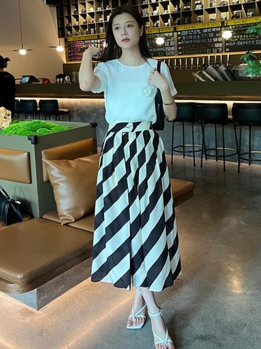 白色短袖是夏季不可缺少的单品,微透质感的短袖比起纯棉的要更加清爽,黑白条纹的半裙能够有遮挡腿部赘肉,高腰线的裙装可以强调身材比例,黑色的斜挎包正好点缀在腰间,进一步强调腰线搭配白色系带高跟鞋,在身高上能够加分不少,也能进一步拉长小腿线条。
