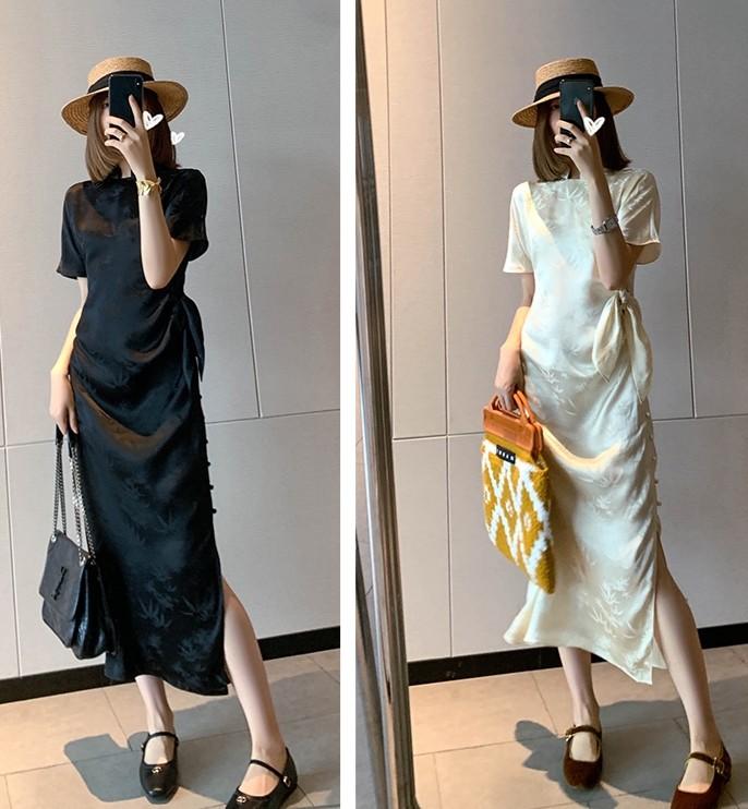 正肩连衣裙可以打造直角肩,在视觉上可以修饰上身身形,开衩的设计露出腿部若隐若现十分撩人,裙摆处的暗纹解决了纯色连衣裙单调的问题,抽褶设计个性十足,裙型的设计大概是参考了旗袍,所以很能凸显女性的风情。