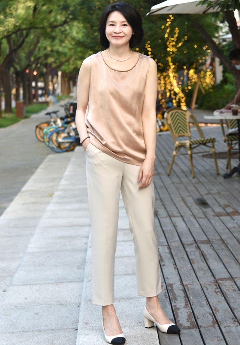 三、桑蚕丝上衣藕色的无袖桑蚕丝上衣,伴着珠光质感的色泽,但无袖上衣对身材的要求比较高,而且桑蚕丝面料的垂感也比较好,所以上身肉感较强的姐妹还是要选择修身硬挺版型的上衣。米色的烟管裤很修饰腿型,大家日常可以抄作业。这套穿搭就有些过于素静,大家在平时在上下装挑选上可以选择一些具有色彩反差的服饰。