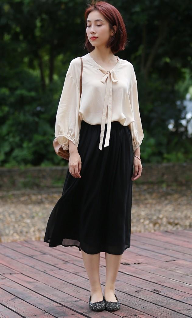 桑蚕丝面料的白色衬衫很有质感,蝴蝶结点缀在领口十分甜美,灯笼袖让穿搭多了一些法式色彩,灯笼袖对手臂粗的姐妹十分友好,大臂粗的姐妹可以优先考虑,黑色纱质半身裙轻盈有飘逸,进一步增添甜美的气质。