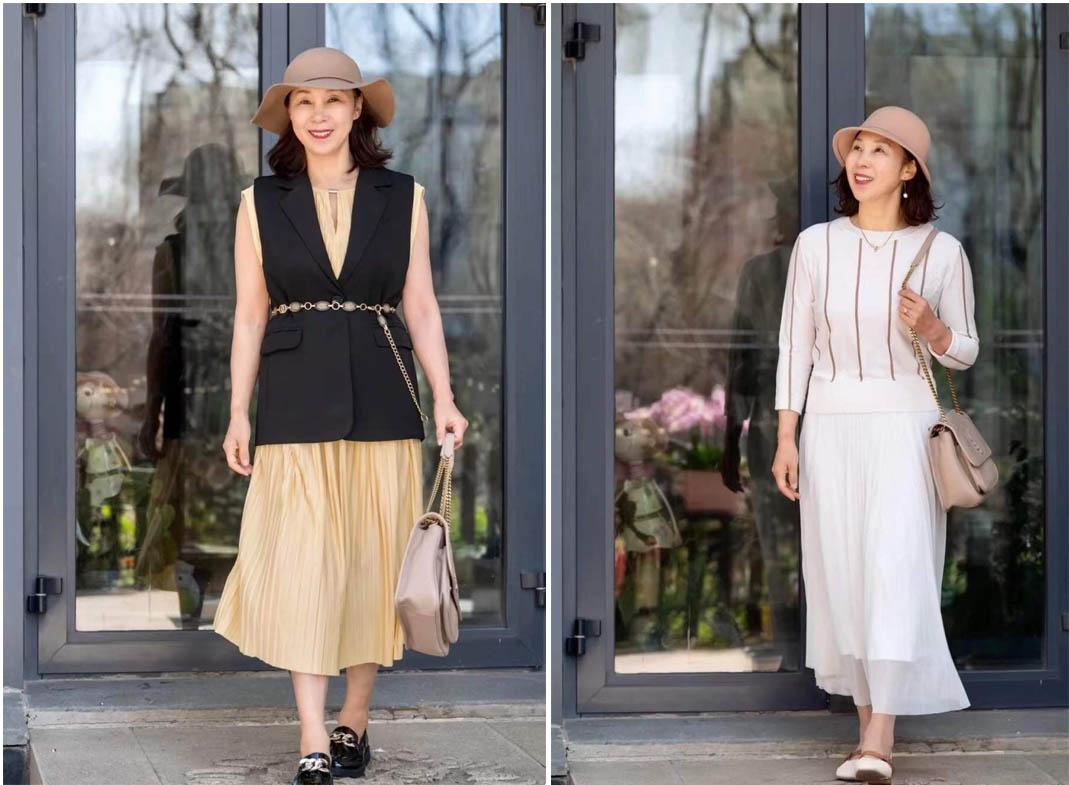 于40+、50岁而言,脸上已经稍显岁月印痕。对比起极简风的穿搭,简单日常,其实并不考验身材,同样的上衣搭配裤子,可以看出来极简风的穿搭更适应普罗大众,更遮肉和端庄得体,显得整体穿搭会更随性。
