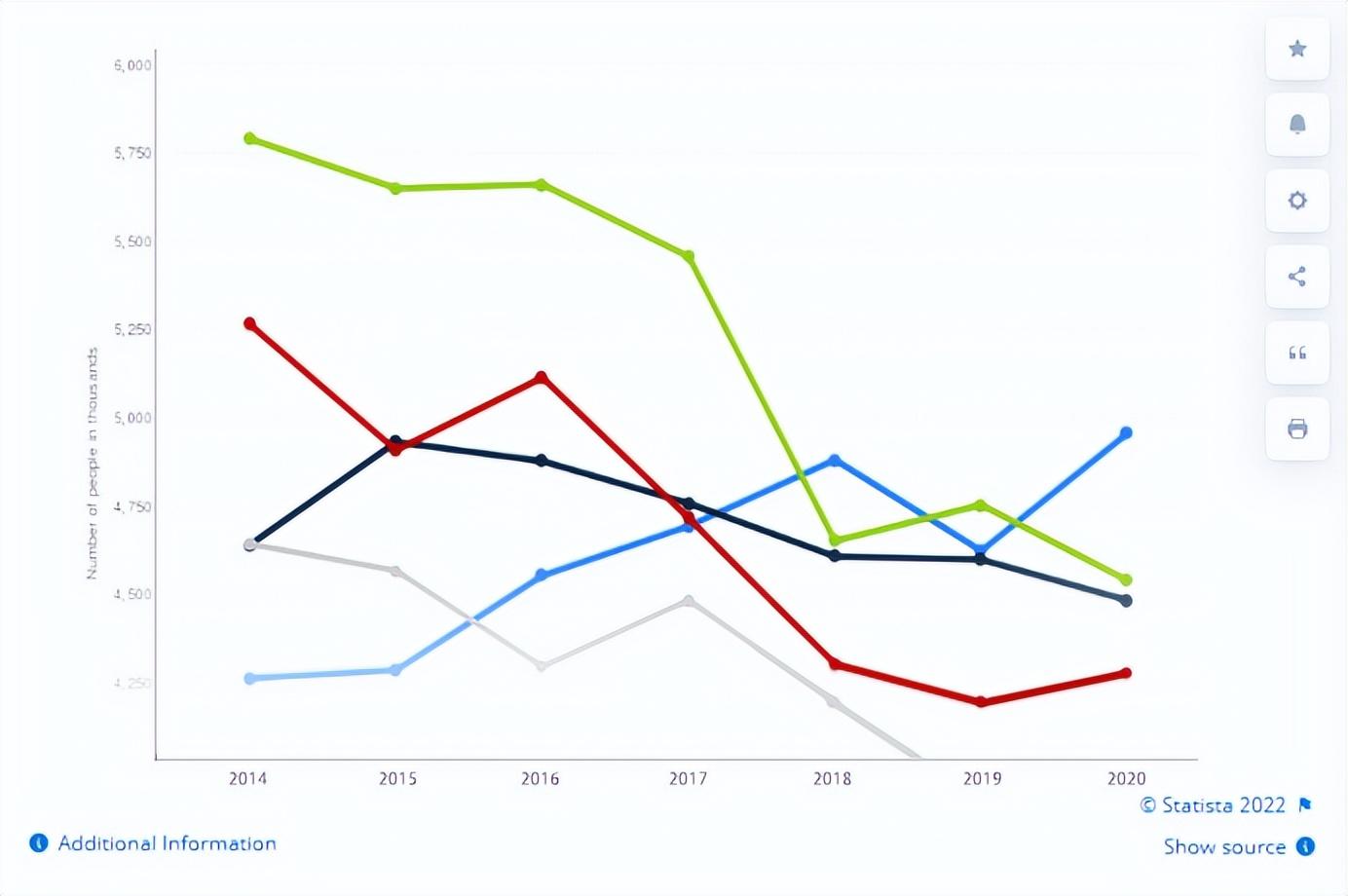 该图表显示了2014年至2020年法国使用女性包袋的人数(按拥有的物品数量),2020年,法国有500万人拥有六个或更多的包袋。2019年市场出现新低,2020年市场有所恢复。