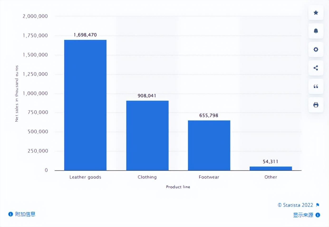 该统计数据显示了2021年Prada按产品线划分(千欧元)的净销售额,2021年,Prada的皮具净销售额约为16.985亿欧元。