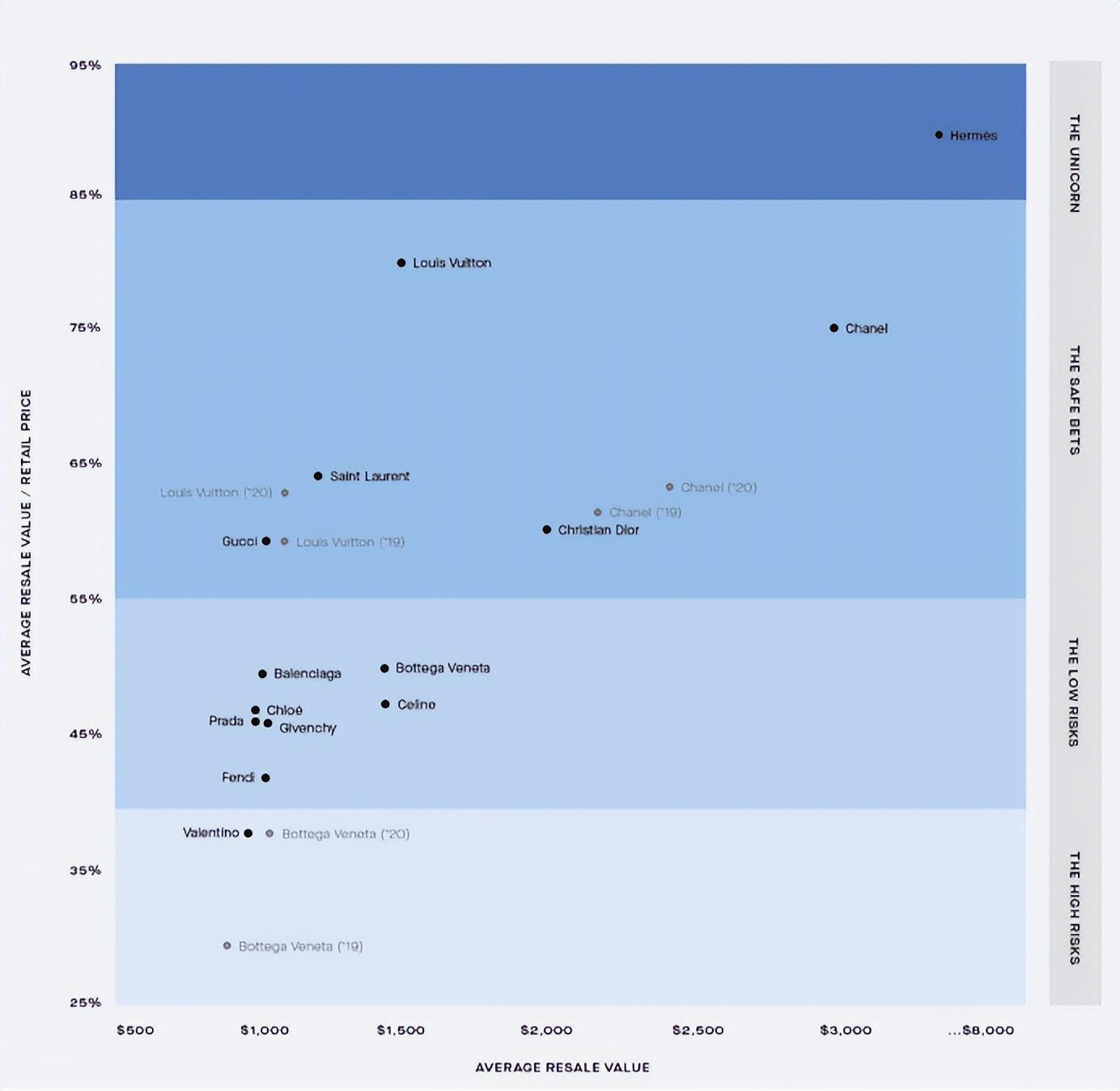 目前来看,坐拥品牌价值前三位的品牌仍然是Hermes、LV、Chanel, 这跟品牌自身的历史文化,以及公司对产品定价和库存的控制有很大的联系。其中,Hermes包袋平均保有其零售价值的90%,Louis Vuitton包袋以80%紧随其后。Chanel手袋平均保有价值为75%,排名第三。