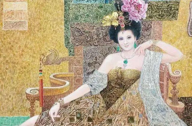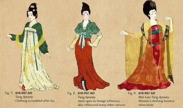 普通女性的日常服饰,大多数以上身穿襦、袄、衫,而下身束裙子。此外,唐代女性穿的襦裙装,有一个典型的特征:裙系在高腰到胸部,或系在腋下,系上丝带,颈部与胸部的肌肤会半露在外边。唐代周濆《逢邻女》诗:“日高邻女笑相逢,慢束罗裙半露胸。”对当时唐朝女性的服饰,作了好的诠释。所以,为什么说,唐朝女性很开放。就是那是的穿着比较前卫,那些丰腴的年轻女子,常常是穿着丝罗制的齐胸襦裙,用束带系紧,就凸显除了女性那种丰腴之美。而杨贵妃本来是一位体态丰腴的美女,做么穿就更迷人了,所以深受唐玄宗的喜爱。
