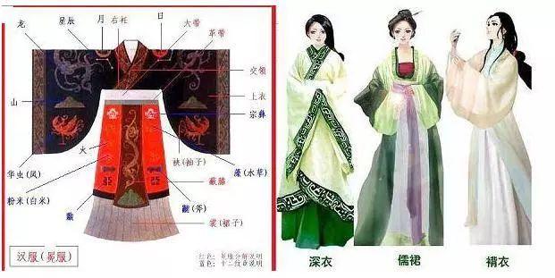 关于先秦时期的衣服款式,在《诗经邶风绿衣》就有体现:“绿衣黄裳。”这里面的“衣”指上衣,而“裳”指的是裙。如果,衣裳连在一起的叫作“深衣”。西周时期的“六服”与黄帝时期的上衣下裳不同,西周时期的冕服是相连的,不分衣和裳,素纱上下相连,称之为“深衣”。当然,春秋时期服饰已经没有那么严格的规定了,当时有两种款式,一种是“上衣下裳”衣裳不相连,另外一种是“深衣”是相连的。