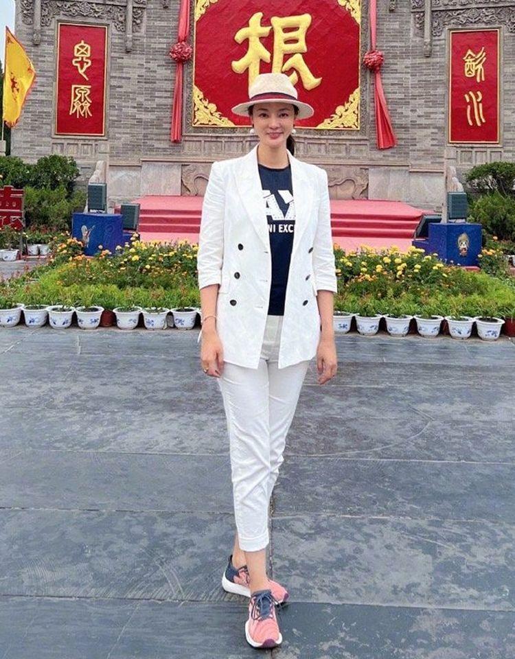 刘芳菲身穿白色西服套装,休闲款式的剪裁结合内搭黑色T恤自带的时尚感,脚踩粉色运动鞋,“半正式半休闲”的混搭风造型不会显得过于严肃。而小礼帽的加持,瞬间提升了造型的精致度,彰显了不俗的时尚品味。