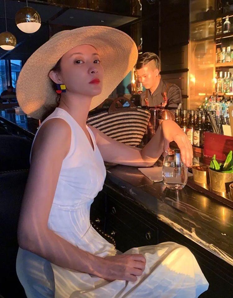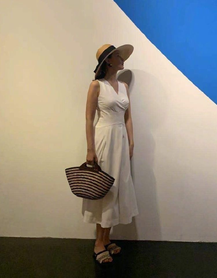 二、刘芳菲的帽子穿搭,值得中年女人学习01、宽檐草帽+连体裙