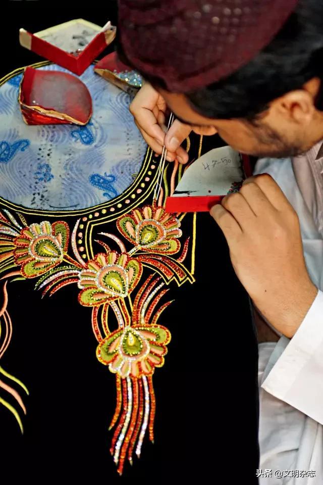 ◎ 贝都因女子衣袍上的刺绣,针法整齐,图案精巧(上图)。迪拜的一名裁缝师傅正在手工缝制长袍,并为其镶嵌上各式珠子和亮片(右图)。