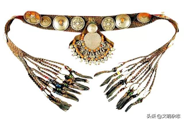◎ 18世纪贝都因人的头饰,皮革质地的带子上镶嵌有大小不一、花纹各式的银钉,两边垂下的流苏上挂满了贝壳和珊瑚。