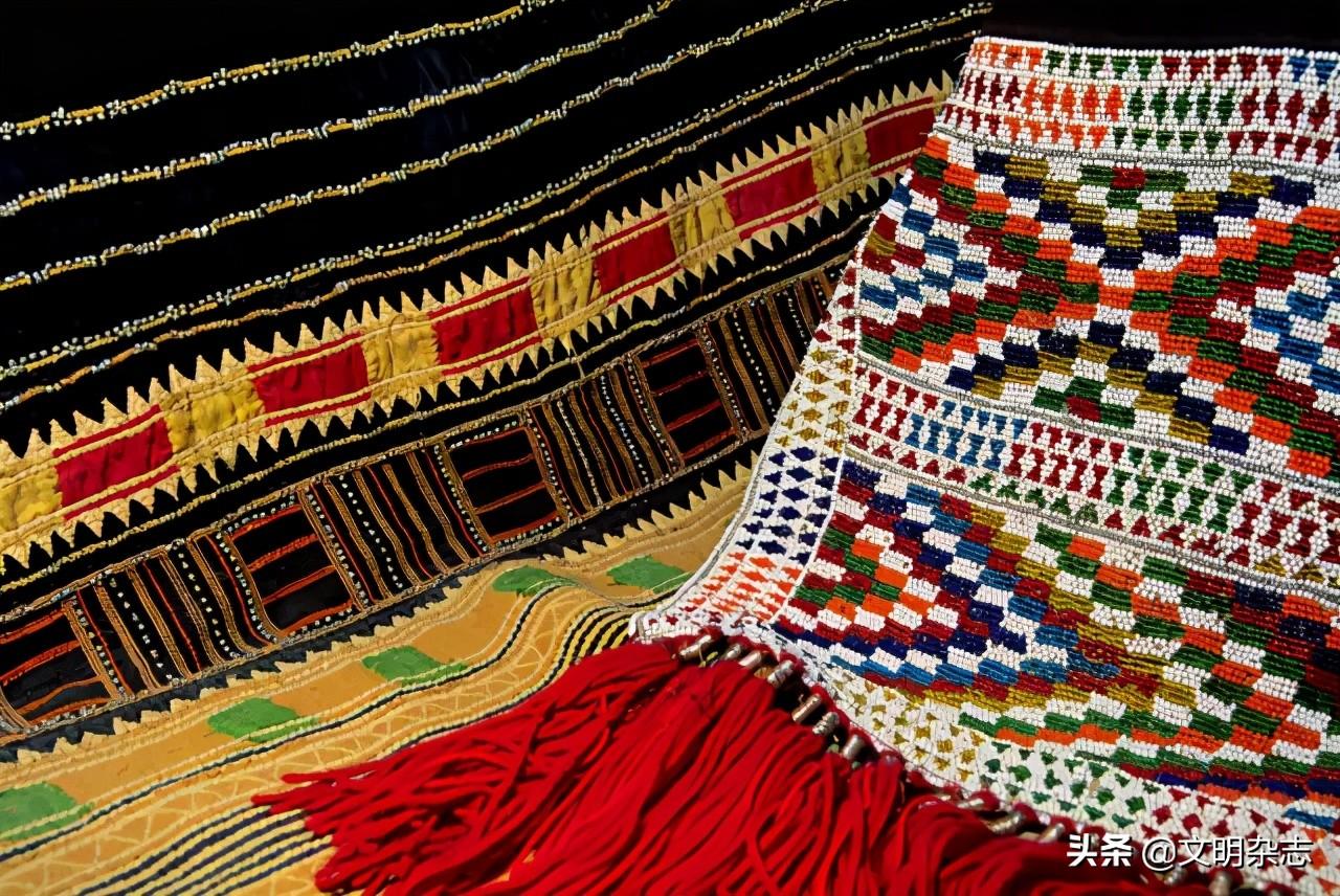 ◎ 在沙特阿拉伯吉达市的一所博物馆里展出的贝都因女子的传统服饰,几何图案交错的布料上边密密麻麻的串满了彩色珠子。