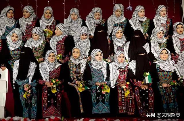 ◎ 巴勒斯坦的集体婚礼上,几十名精心装扮的新娘子坐在一起。她们有的穿着包裹严实的长袍,只露出双眼;有的则穿着露出整个脸部的传统长袍,端庄大方。