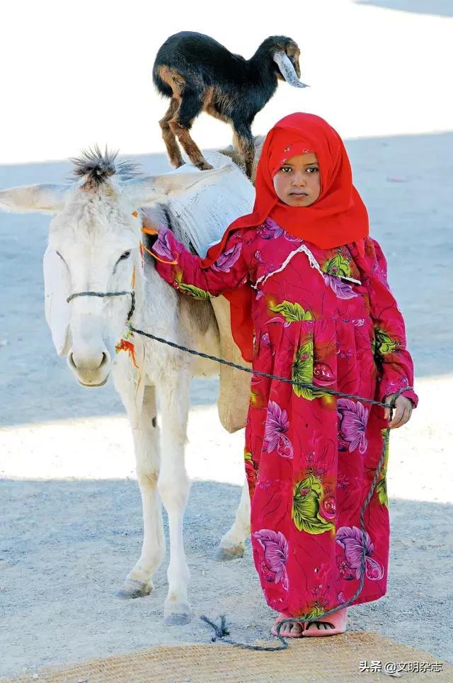 ◎ 位于埃及东部红海沿岸的红海省首府——古尔代盖,一个贝都因小女孩牵着她的驴和小羊。她身穿胭脂红绣花长袍,头上缠着颜色相近的头巾,整个人看上去秀气伶俐。