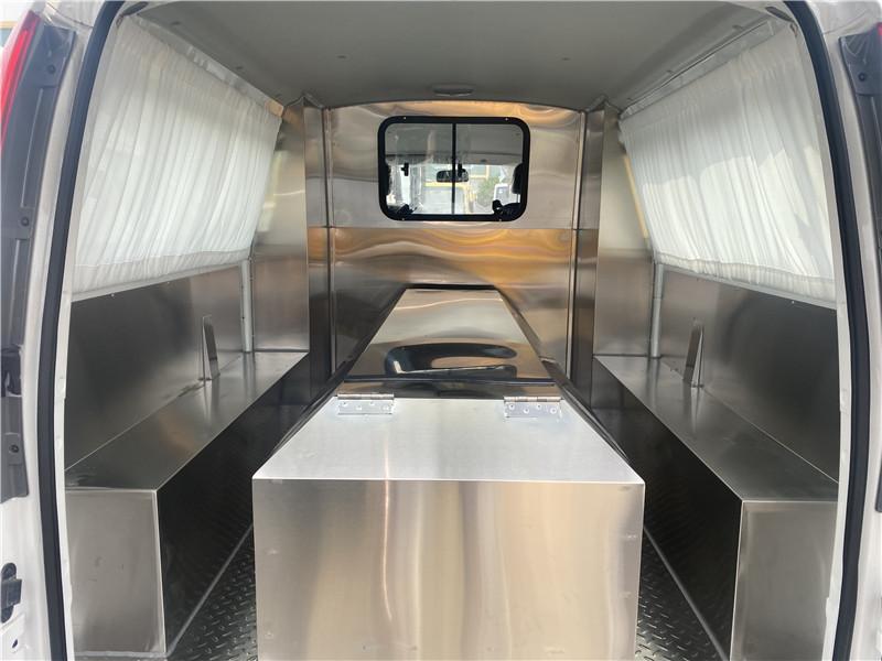 2.殡仪车后仓为不锈钢内饰,两侧不锈钢长条座椅带储物功能,中间放置不锈钢常温棺或者不锈钢冰棺,可加装负压装置及消毒灯逆变器等配置。