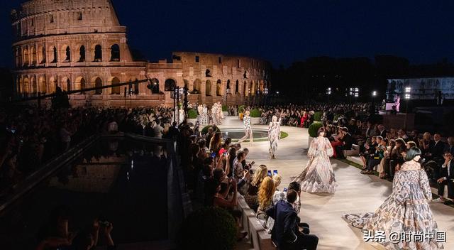 而FENDI 2019“罗马精神的黎明”(Dawn of Romanity)高定系列将秀场选在了位于罗马城的维纳斯神庙,致敬于当年离世的设计大师Karl Lagerfeld,FENDI一如既往地用高级定制系列复活一个个迷人的罗马传说,的高定服饰如走马灯般铺开一幕幕精彩的故事画卷,深得罗马电影城(Cinecittà)的精髓。