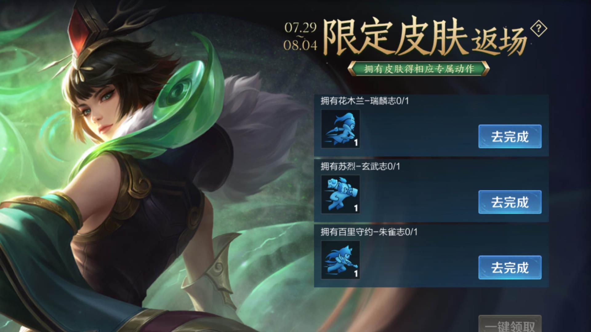 3款限定即将半绝版说到限定皮肤,近期有几款限定皮肤很快就要下架了,也就是之前返场的三款限定皮肤,分别是花木兰瑞麟志,百里守约朱雀志还有苏烈的玄武志,三款限定皮肤在8月4号之后就会下架,其中两款皮肤都是第一次返场,但是这次返场过后,这三款皮肤都不会通过直售的方式返场。