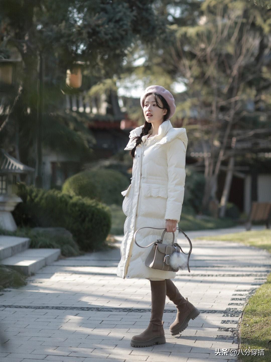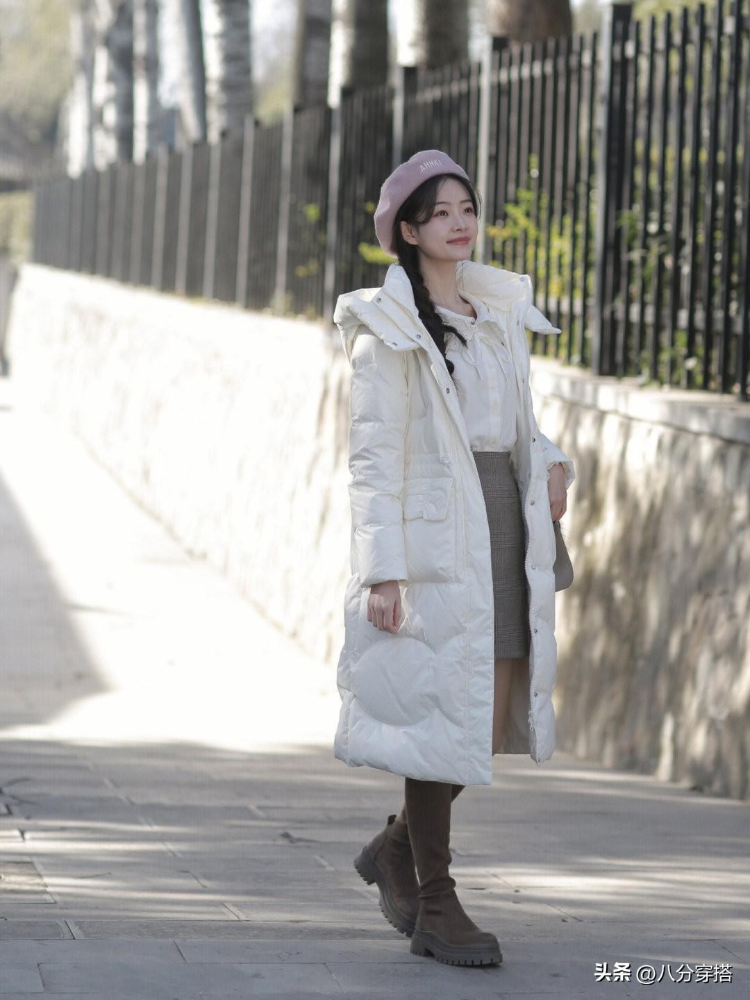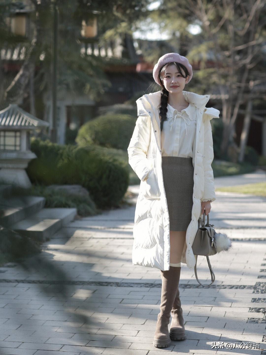 选择白色的长款羽绒服本身就是比较清爽优雅的,又是直筒的版型设计,包容性更强,内搭一件娃娃领的白色衬衫和细格纹的半身裙,文艺优雅,清爽知性又时髦,这样一身打扮的温柔甜美,而且视觉上也不臃肿,自身的穿着体验也是比较舒适暖和的,用贝雷帽和长筒靴来进行点缀,更多了几分复古感。