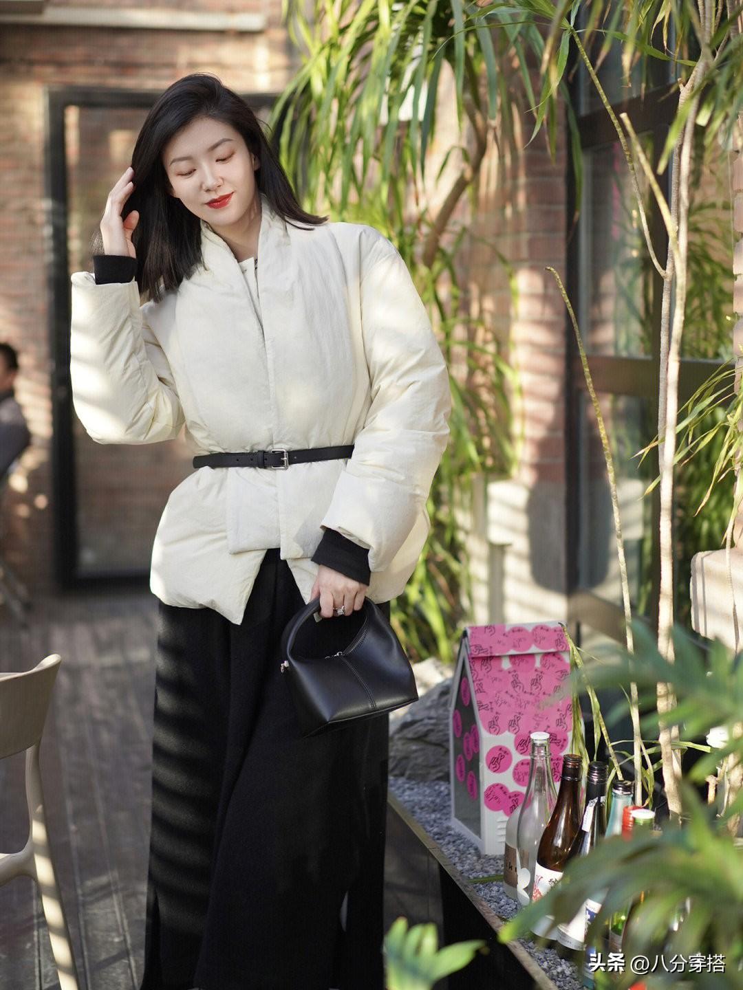 比如下面的这一身搭配 白色的羽绒服款式简洁利落,线条也的流畅,内搭全部选择了黑色,黑色的圆领针织衫,黑色的阔腿裤。干净清爽高冷又霸气。还借助了细腰带来点缀,勾勒腰身的位置更加的显高显瘦,彰显女强人的霸气与洒脱风范。