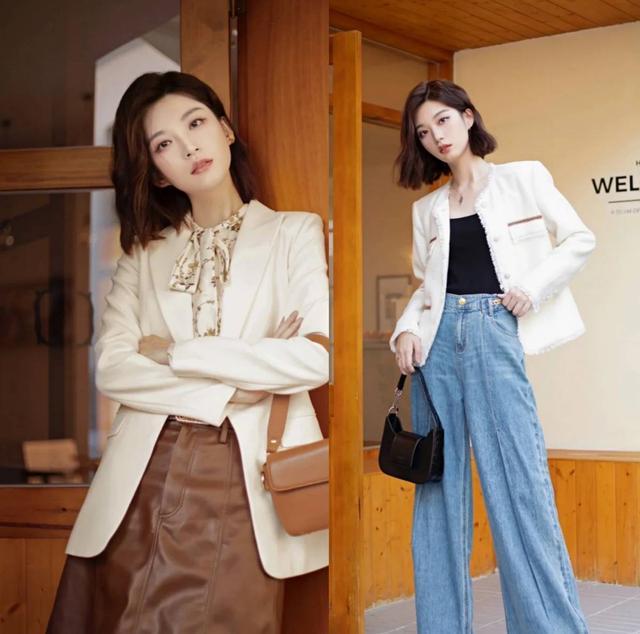 这款清爽的白色小西装,因为色彩的运用特别的干净,可以减轻它形成的肃穆的氛围,用来塑造显气质的穿搭也更加的方便,在里面可以叠加一条蓝色的裙装,可以是宽松一点的衬衫裙,杂糅着衬衫的大气感和裙装的优雅氛围。