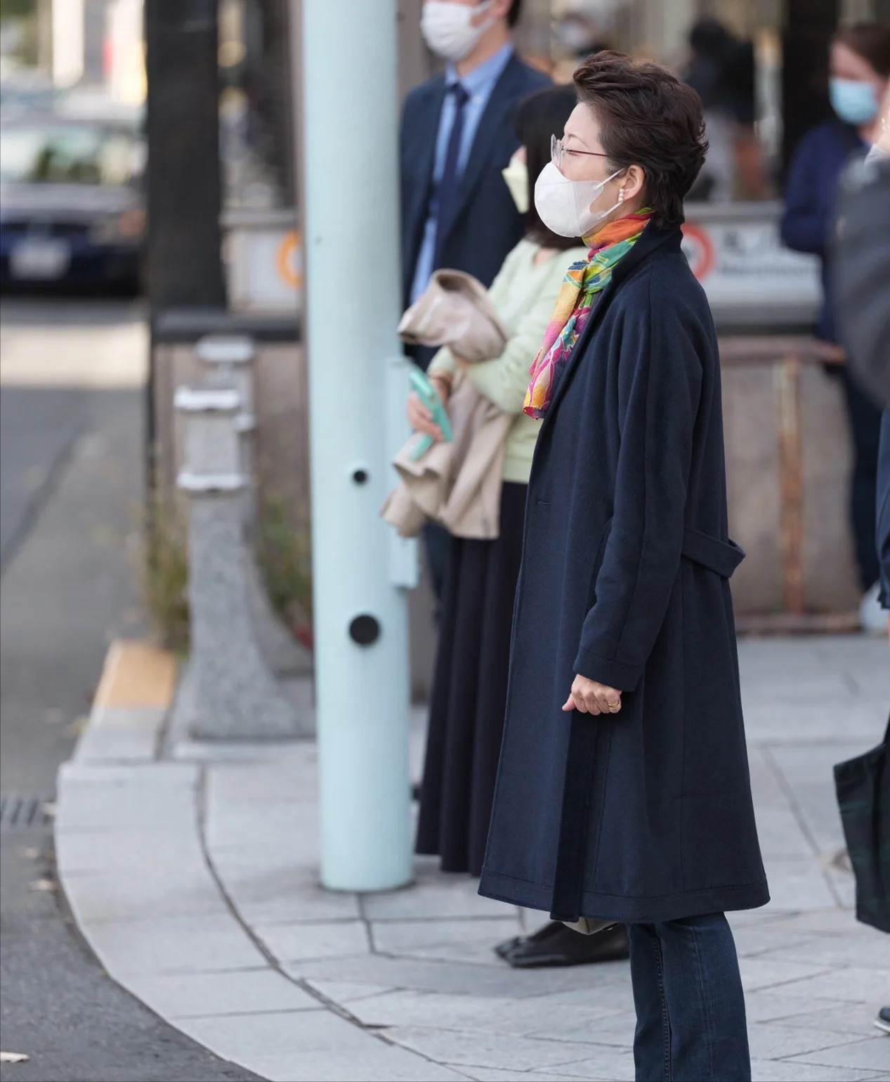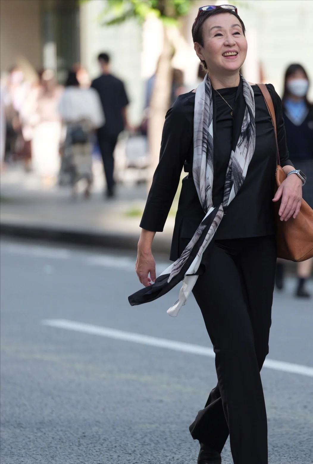 日本老人虽然爱穿基础款的服装,但她们很懂得利用细节来放大这种简约的美感。例如全身黑是很多中年女性都会选择,沉稳大气,但大多数人穿着一身黑都缺少美感,容易显得沉闷老气。此时化解老气的好方式就是选择明艳配饰点缀,这一身在脖颈间点缀黑白印花丝巾,随意地搭在颈部,是点缀同样也能让肤色更加透亮。