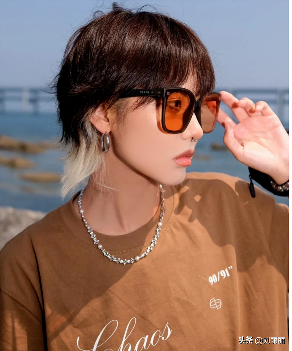 女士狼尾短发搭配超短的刘海,一看就让人过目不忘,再配上一个墨镜,真是满满的回后率,简直帅到爆表。